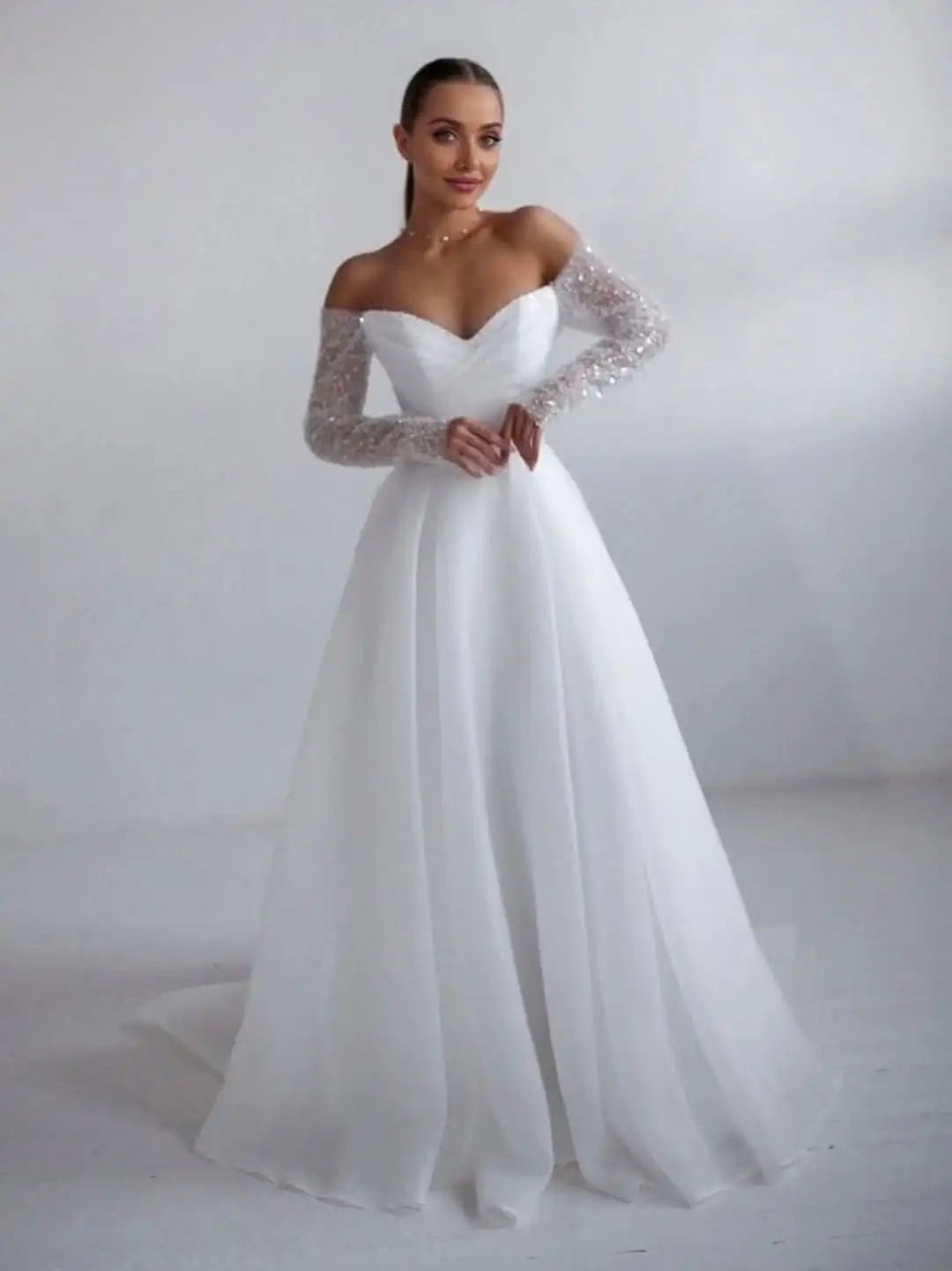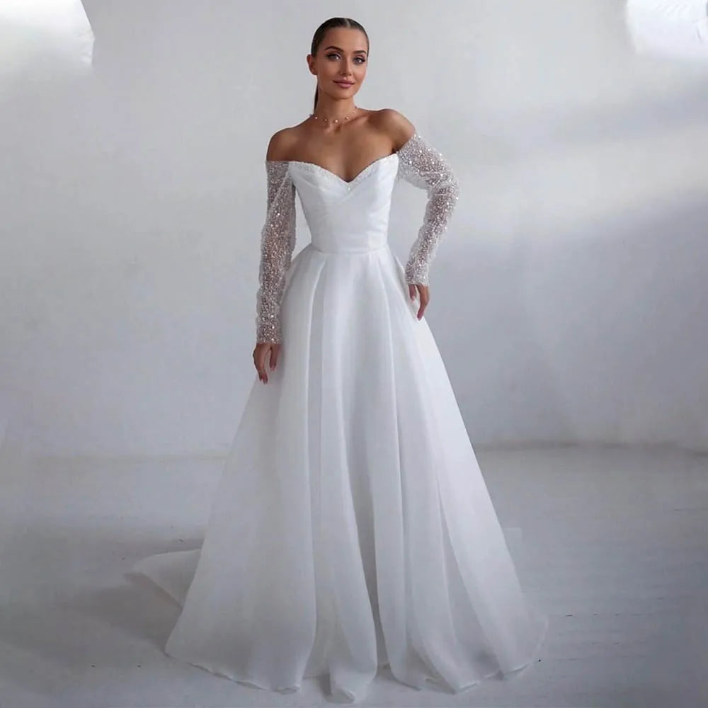 Shiny Long Sleeves Pleat Sweethart Bridal Grown A Line Wedding Dresses Custom Made 2026 Vestido De Noival