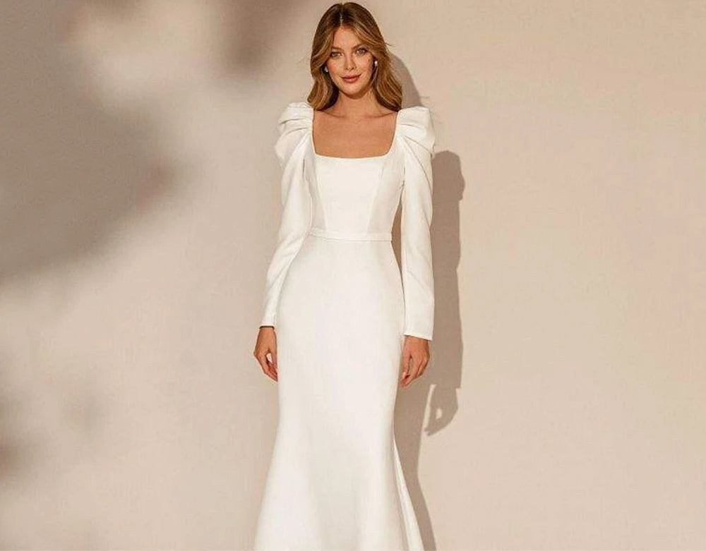 Long Sleeve Satin Midi Wedding Dress with Square Neckline – Elegant Minimalist Bridal Gown | Maison Bridal