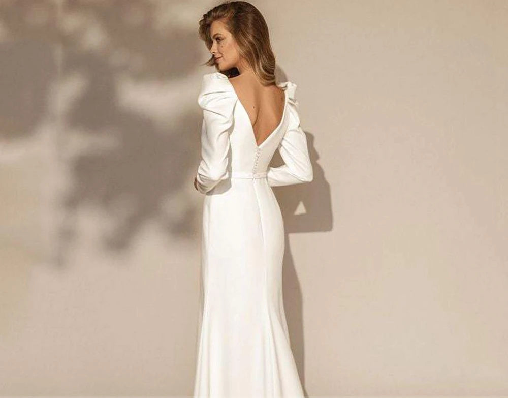 This luxury bridal gown showcases a square neckline that highlights the collarbone and frames the face beautifully, while the structured long sleeves with delicate puff shoulders add a touch of vintage-inspired elegance. The clean architectural lines of the dress flatter the silhouette, creating a sleek hourglass shape that exudes confidence and poise.