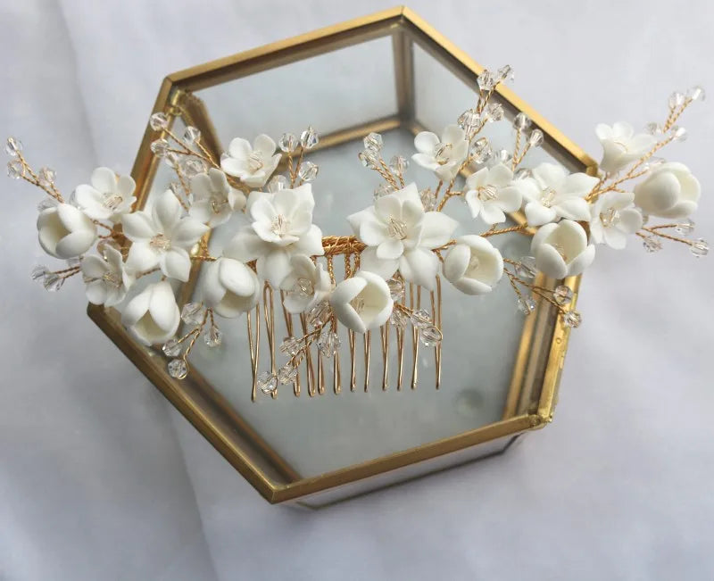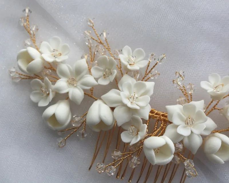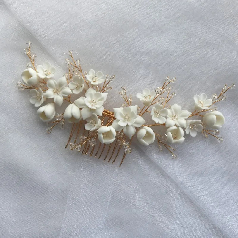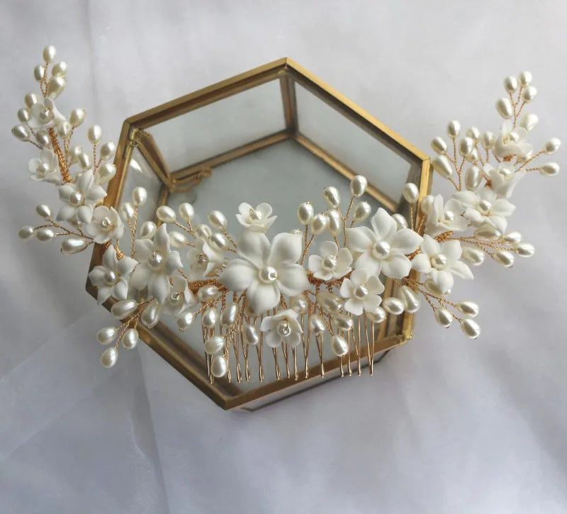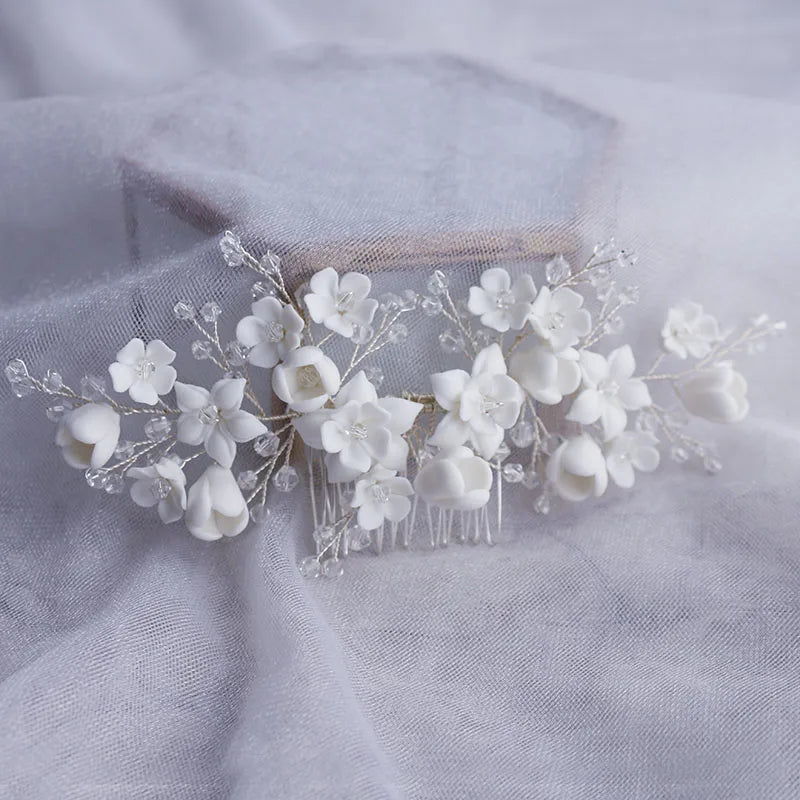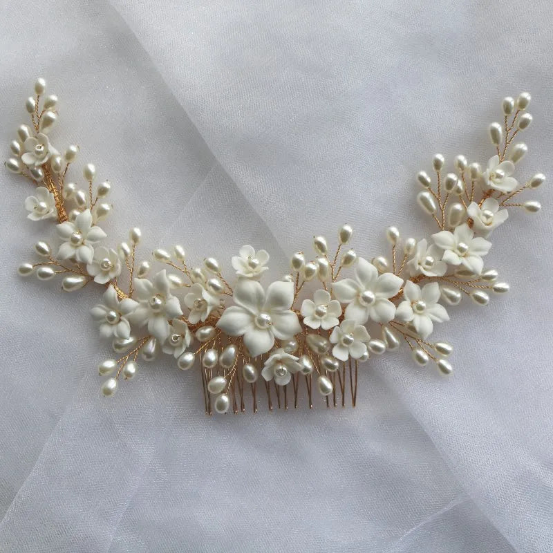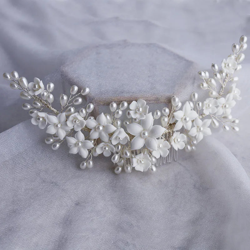White Ceramic Flower Hair Comb Bridal Crown Pearls Jewelry Handmade Wedding Headpiece Fashion Women Hairpiece