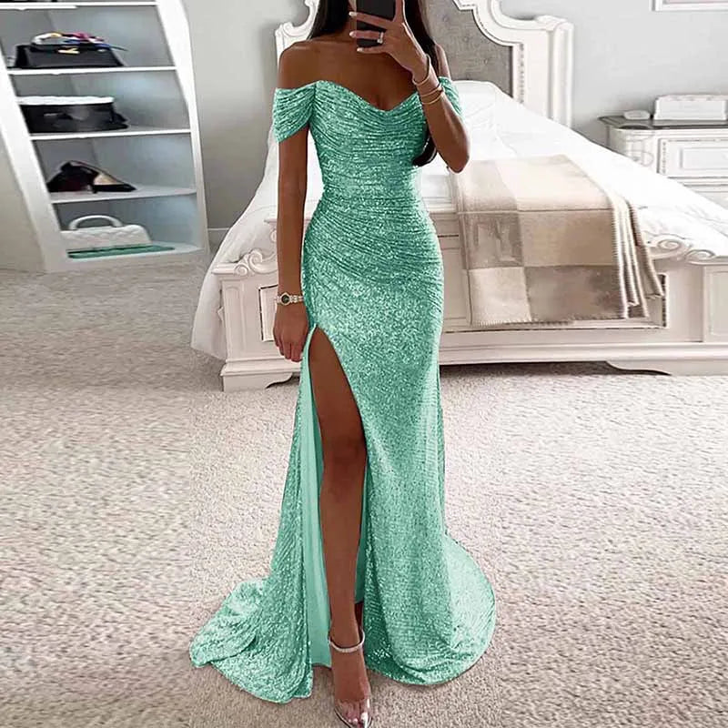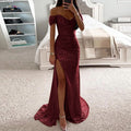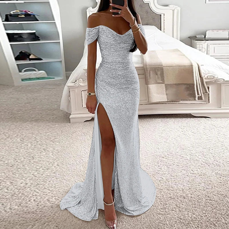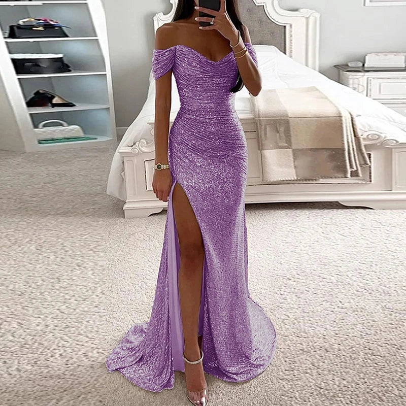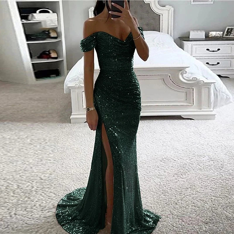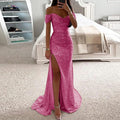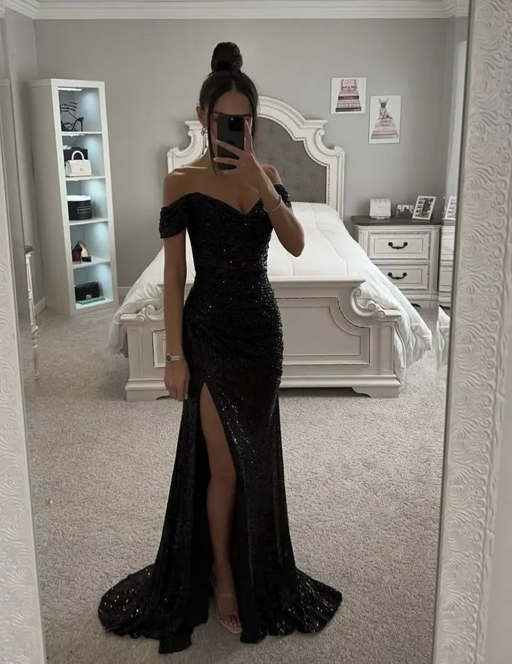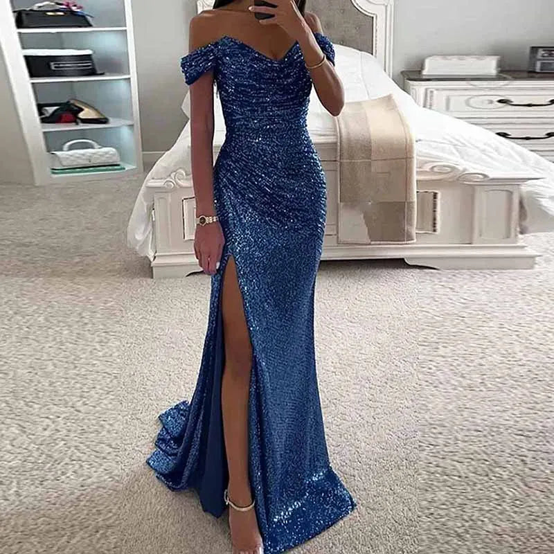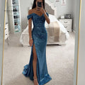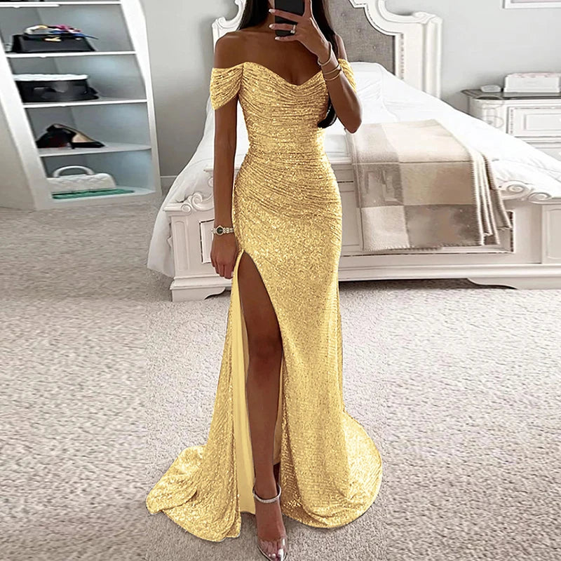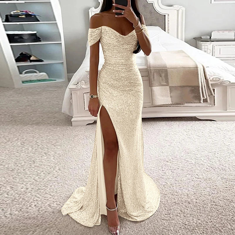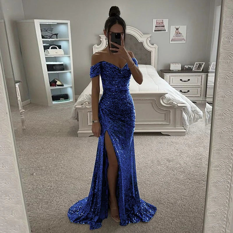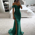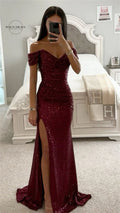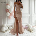 Women Mermaid Champagne Evening Maxi Dresses 2025 Elegant Off-Shoulder Sequin Split Formal Prom Dresses For Party Customized